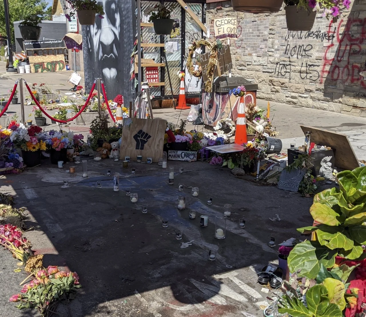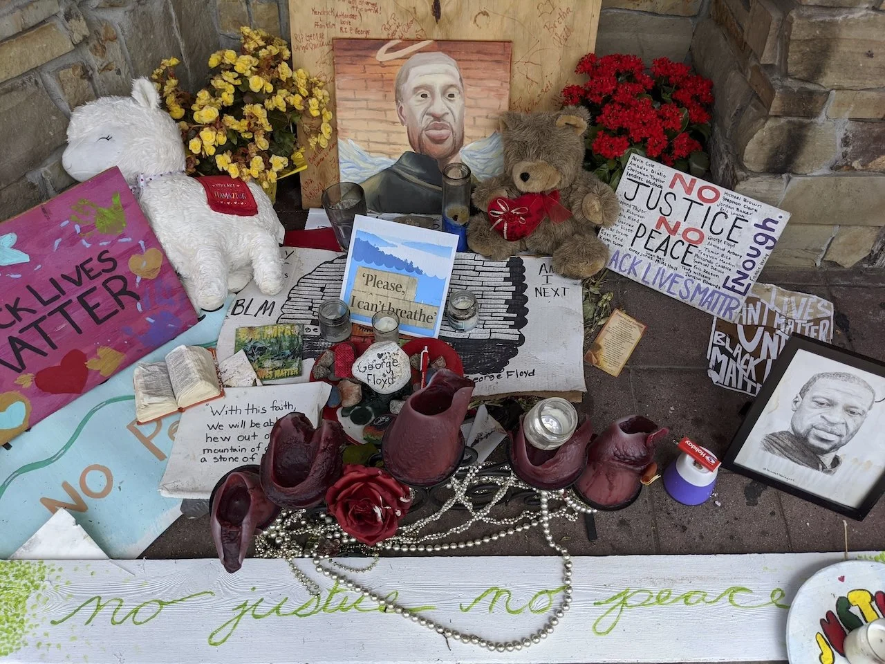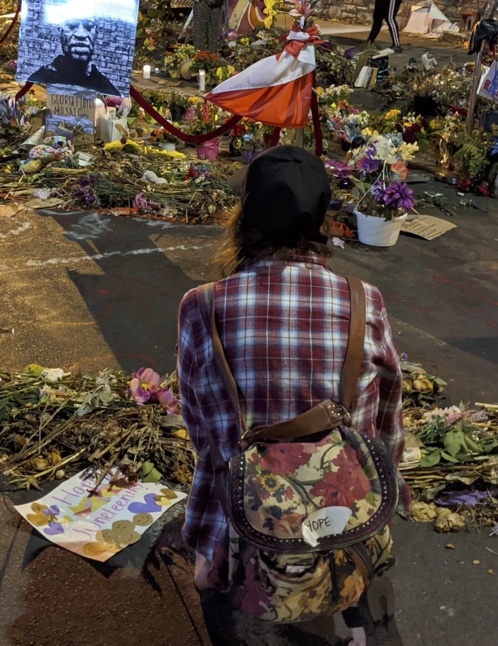 On May 25th, 2020, George Perry Floyd Jr., a Black man from Minneapolis, was murdered by Derek Chauvin, a White police officer. The killing, captured on video, drew the wide attention of the nation and the world. 38th and Chicago where George was killed has become a memorial, a sacred site - George Floyd Square. It is a focal point for demonstrations, protest, community gatherings, personal expression, and a call for racial justice. Thousands of people have visited the site, leaving flowers, paintings, treasured objects, and words of sadness, fear, anger, inspiration, love. I began to photograph at the Square three days after the killing and have returned hundreds of times and will continue. It is an evolving story. My purpose here is to document this deep well of generosity and communal desire to give, to connect with one another, to make change happen.